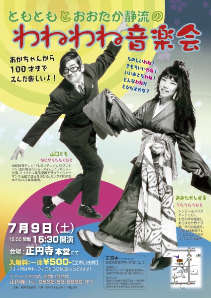 2011年7月9日(土)15:30 愛知県豊橋市 “正円寺(しょうえんじ)本堂” (豊橋市牛川町浪の上13) 出演:山口とも(廃材打楽器)、おおたか静流(うた) 料金:500円 問:0532-53-6890(正円寺)
