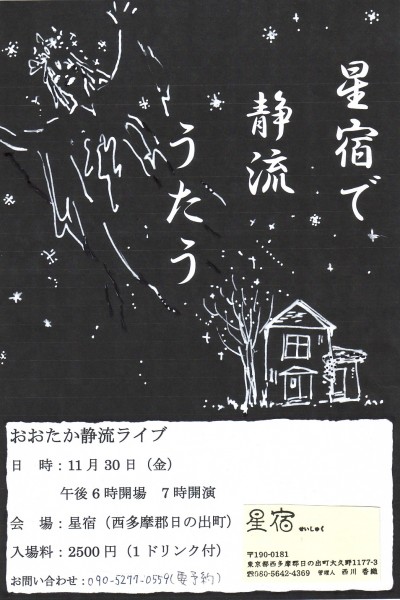 2012年11月30日(金)19:00(18:00open) 東京日の出町 “cafe 星宿(せいしゅく)”(西多摩郡日の出町多久野1177-3、℡080-5642-4369(管理人 西川香織)) 出演;おおたか静流(歌/アカペラ) 料金;2500円(1 drink付) 問&予約;090-5277-0559(要予約)