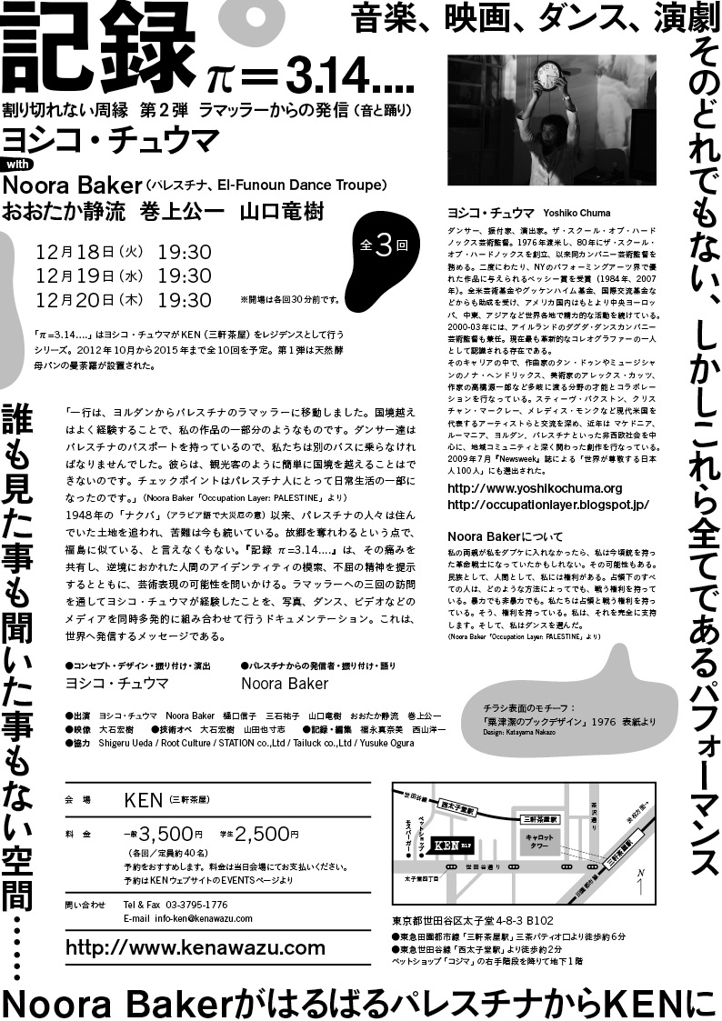 出演; ヨシコ・チュウマ、Noora Baker(パレスチナ、El-Funoun Dance Troupe)、樋口信子(dance) / 三石祐子(dance) / 山口竜樹(dance) / おおたか静流(voice) /巻上公一(voice)