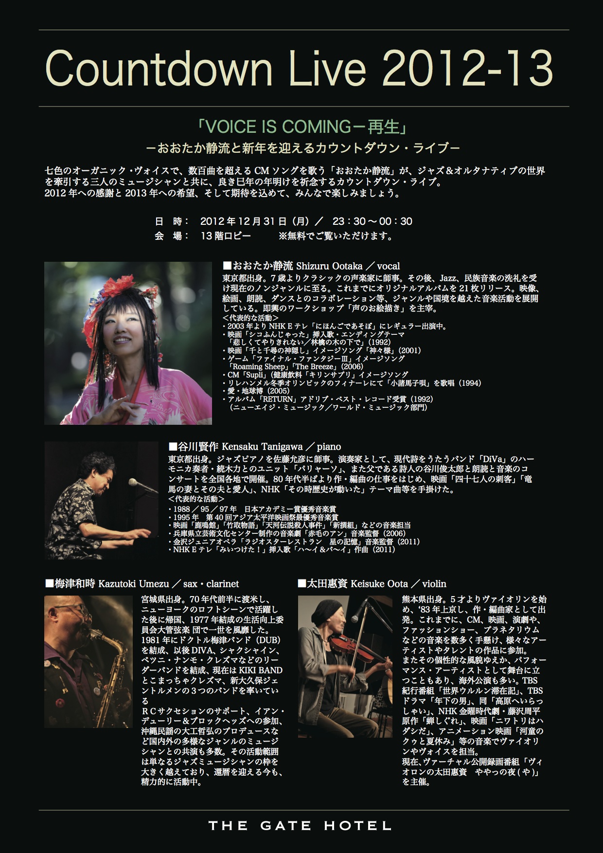 出演;おおたか静流(歌)、谷川賢作(piano)、梅津和時(sax・clarinet)、太田恵資(violin)