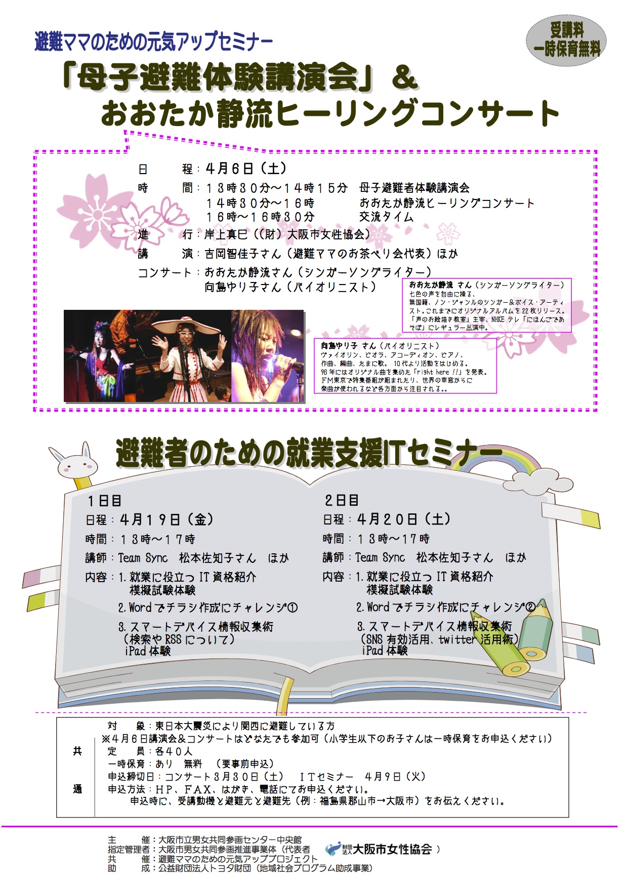 問&申込;財団法人大阪市女性協会(〒543-0002大阪市天王寺区上汐5-6-25、℡06-6770-7200、FAX06-6770-7705、E-mail:m.kishigami@creo-osaka.or.jp)