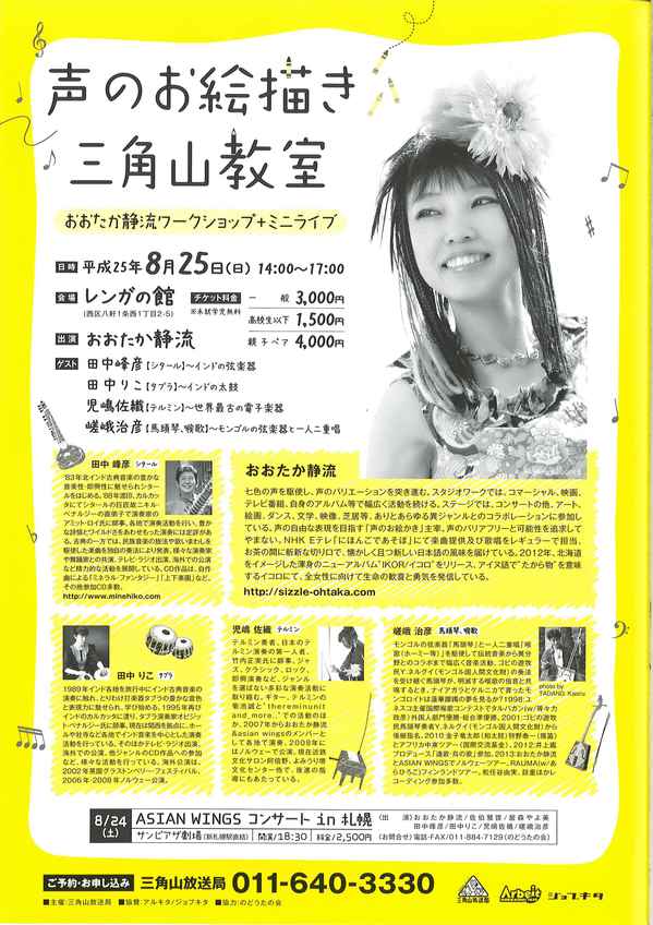 講師&出演;おおたか静流(うた)、田中峰彦(シタール)、児嶋佐織(テルミン)、田中りこ(タブラ)、嵯峨治彦(馬頭琴、喉歌)