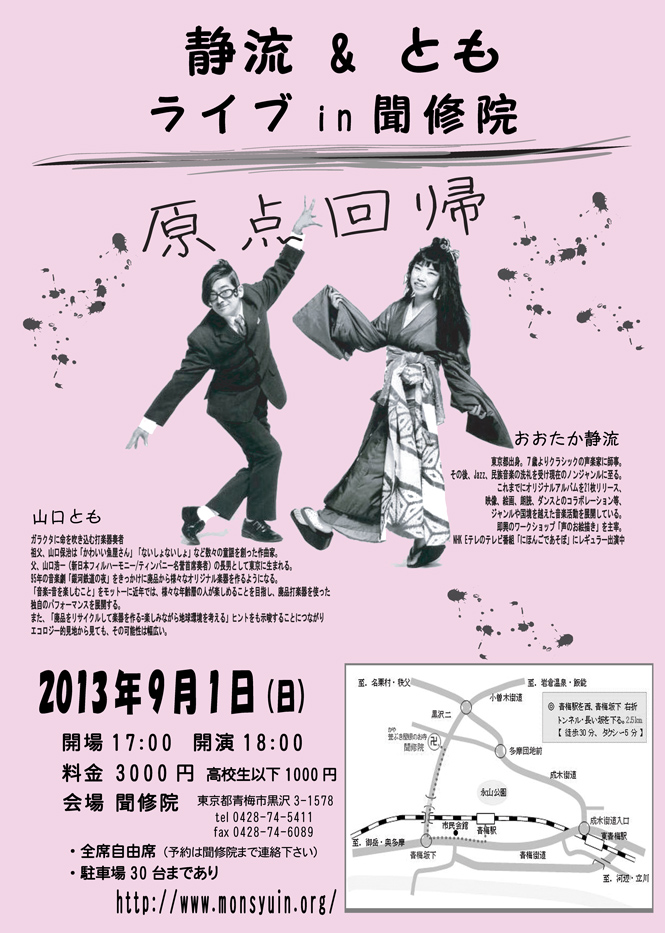 ※毎年恒例となった、おおたか静流コンサート@聞修院は、最初に行った「山口とも」と一緒に原点回帰します!喜びの原点、愛の原点、祈りの原点・・・・・特別な夜を、いつもの寺でご一緒しましょう!
