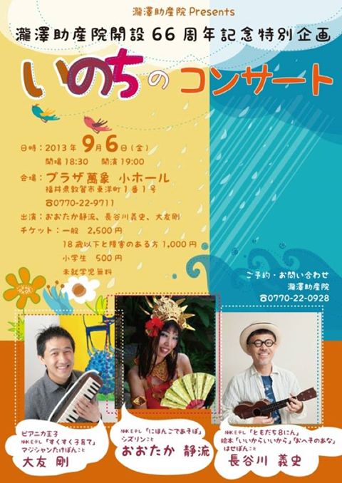 ※日本三大産婆のひとり、瀧澤和子さんの「瀧澤助産院」開設66周年を記念した、スペシャル・コンサートです。歌ありマジックあり、ライブペイントありの特注にて、素晴らしい助産院「瀧澤助産院」の集いに、どうぞお集まりください。