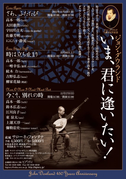 ※シェークスピアと同時代の作曲家でリュート奏者ダウランドを、現代の東京で聴くという、スペシャルな企画です。もちろん私にとって初めての試みです。450年の時空を超えて再演される名曲の数々!きっと特別な夜になるに違いありません。