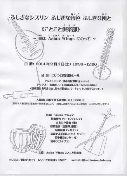出演:Asian Wings(佐伯雅啓 (ウード、サンシン)、おおたか静流 (歌)、嵯峨治彦 (馬頭琴、喉歌)、児嶋佐織 (テルミン)、居森やよ美(歌、カオス・パッド)、田中峰彦(シタール)、田中りこ(タブラ))、ことこと倶楽部(歌、躍り)