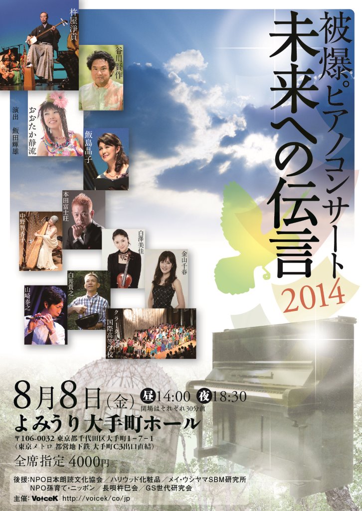 出演; 杵屋淨貢(三味線)、谷川賢作(ピアノ)、おおたか静流(歌)、飯島晶子(朗読)、中野智香子&本田富士旺(ハープ&ピアノ)、白澤美佳&金山千春(ヴァイオリン&ピアノ)、山崎泰之(笛)、白井貴之(シンギング・リン)、クラーク記念国際高等学校パフォーマンスコース(歌・朗読・コーラス)