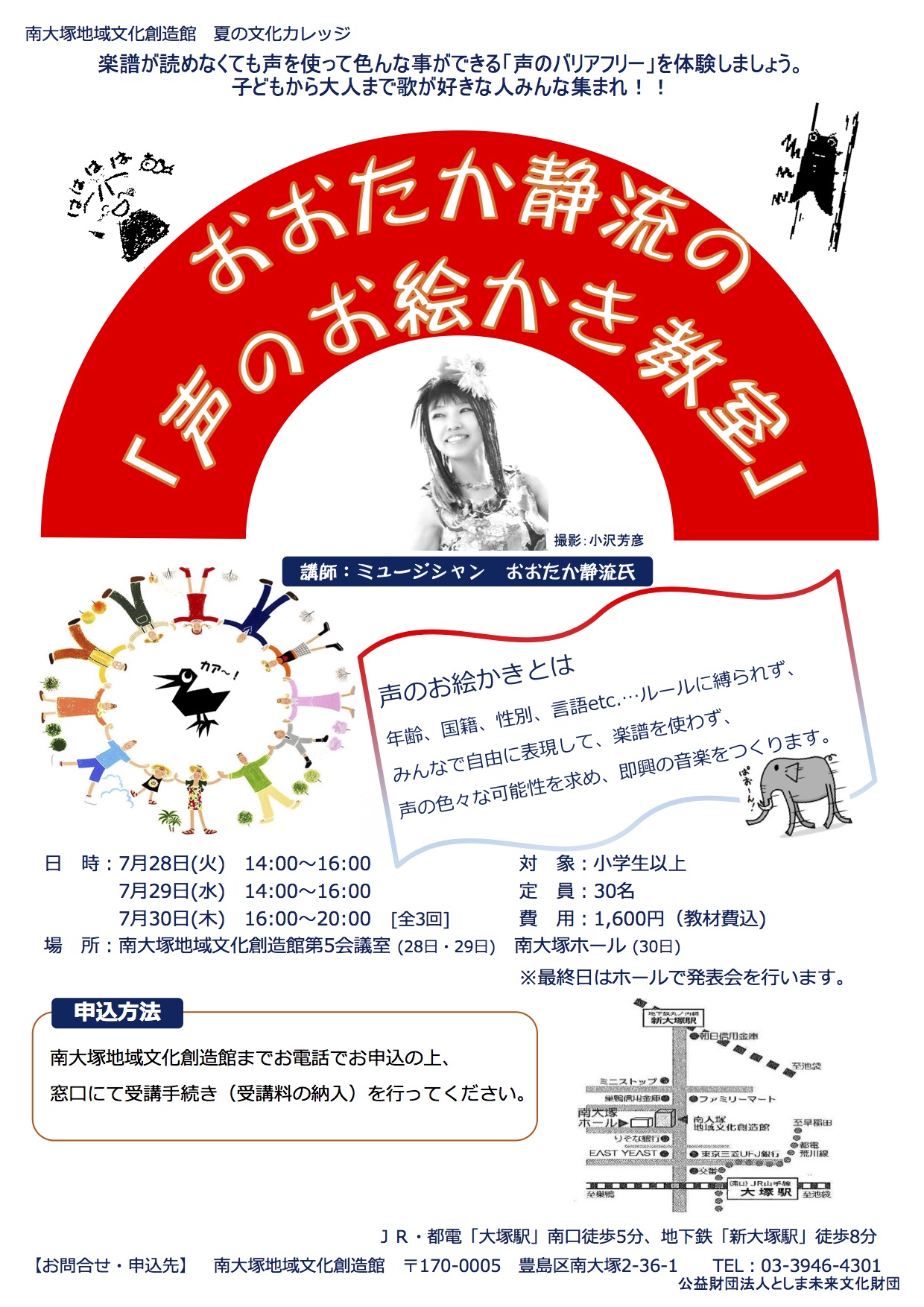 申込方法:南大塚地域文化創造館まで電話(03-3946-4301 )で申込の上、窓口にて受講手続き(受講料の納入)を行ってください。