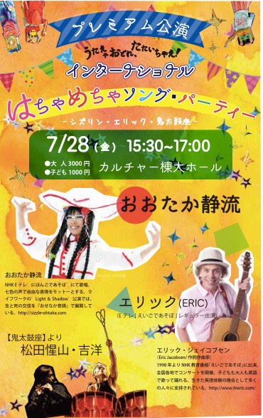 ※「にほんごであそぼ」のおおたか静流と「えいごであそぼ」のエリックがドッキング!さらに鬼太鼓座の名物/松田惺山さんと吉洋さんが参加で、太鼓や尺八が入り乱れます。インターナショナルで何でもありのエッセンスが満載です。どうぞいらしてください。代々木でお待ちしています!