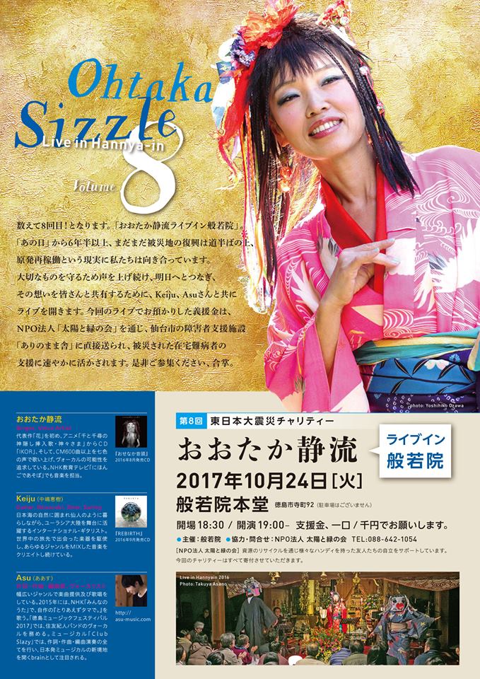 ※東日本大震災被災地支援を目的としたチャリティライブを、徳島市内の般若院本堂にて開催します。2011年3月、10月、2012年以降も毎年開催を重ね、今回が8回目。これまでに総額140万3397円が、「般若院」及び「太陽と緑の会」より「社会福祉法人ありのまま舎」(身体障害者支援・難病ホスピスなどの活動)に送られました。これは沿岸部の在宅難病患者の皆様の支援に活用されています。細く長く、持続的な支援をされていることに敬服します。今年も般若院でお逢いしましょう。