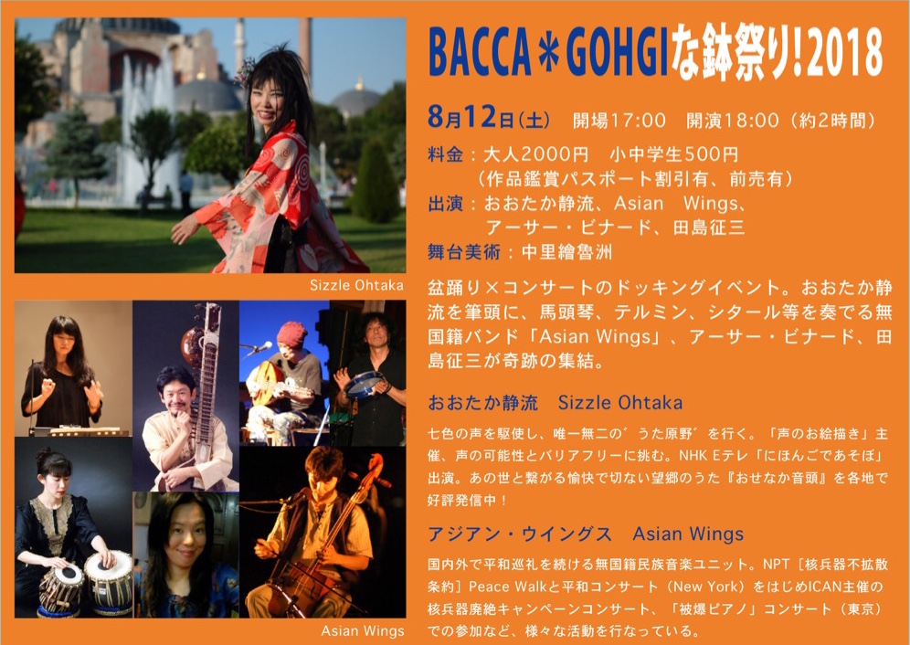 ※毎年恒例、盆踊り×コンサートのドッキングイベント。生きものたちが暮らす「ビオトープ」を背景に、シズリン、無国籍バンドAsian Wings、詩人翻訳家アーサー・ビナード、田島征三が奇跡の集結。舞台美術に中里繪魯洲を迎え、生きとし生けるもの全てが踊り歌う、一夜限りのばっかごーぎな(←ものすごい)お祭りを開催します!
