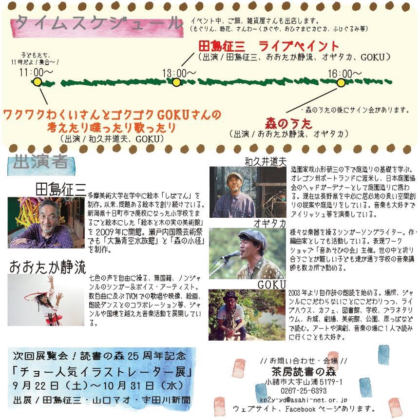 出演:田島征三(ライブペインティング)、おおたか静流(歌)、オギタカ(キーボード・打楽器他)、GOKU(作詩・リーディング)