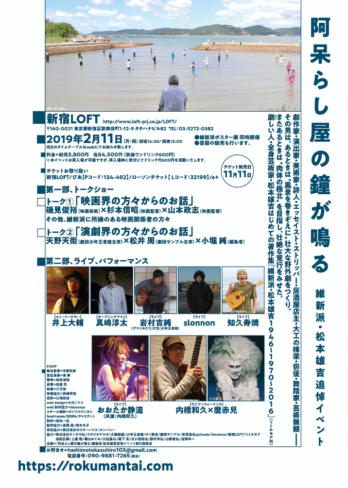 ※維新派の松本雄吉氏を偲ぶ特別な日になります。「王國」で主題歌『Go along a river』は松本氏の言葉を得て望郷の血潮のように心に流れ込んできました。大好きな歌です。溢れる思い出を辿りにどうぞお集まりください。