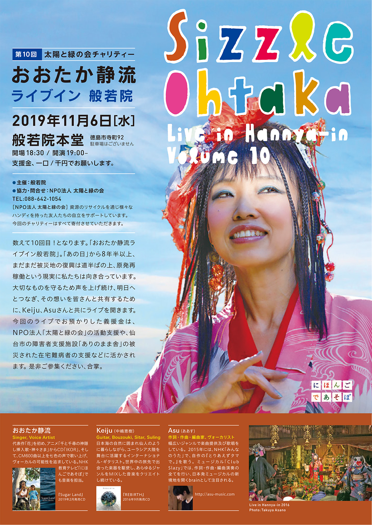 ※2011年からスタートし今回で10回目になります。住職の読経から始まり音楽は祈りの波に運ばれる船のように、時間の旅をします。≪般若院≫と≪太陽と緑の会≫が弱者の為に注ぐ熱き魂に敬服しつつ・・・では徳島にて!