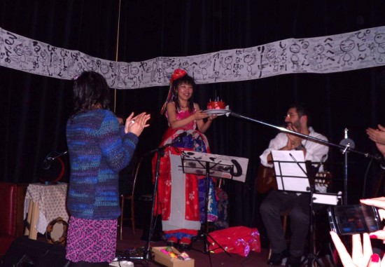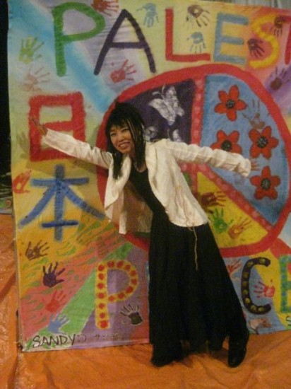 デザインで参加の浅葉和子さんが、パレスチナの子供達と行ったワークショップで、こんなフラッグが出来上がりました。終演後のショット!