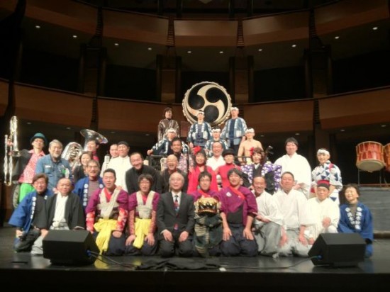岩手県からの湧水神楽と、鬼太鼓座、ミュージシャン一同で記念撮影!伝統的な芸能である神楽。凛とした和太鼓の世界に、微笑ましい場面も織り交ぜた鬼太鼓座、それに絡むブラス、義太夫、鎮魂歌、島歌などが入り混じり、西洋と東洋~伝統とオリジナルが折り重なる波のよう・・・・