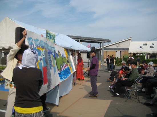 さてこの島で、我が愛すべき田島征三さんと、ライブペインティングをしました!私が即興でヴォイス・パフォーマンスすると、8メートルもの長いロールペーパーに、征三さんが何やら描いていったのでした・・・・・